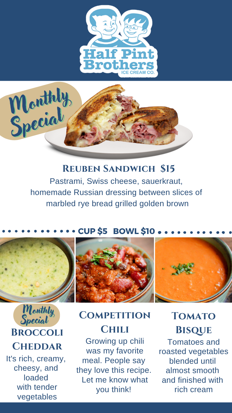 Winter hours are back and so are our soup and sandwich specials! * OCTOBER - Salmon Chowder and "El Jefe" Cubano Sandwich * NOVEMBER - Broccoli Cheddar Soup and Classic Reuben * DECEMBER - Chicken Enchilada Soup and "THE" Tuna Melt * FEBRUARY - Zuppa Toscana and Papa's Italian Grinder * MARCH - 3rd Place Gumbo and Club Sandwich * APRIL - Clam Chowder and Mama's Meatloaf Sandwich *